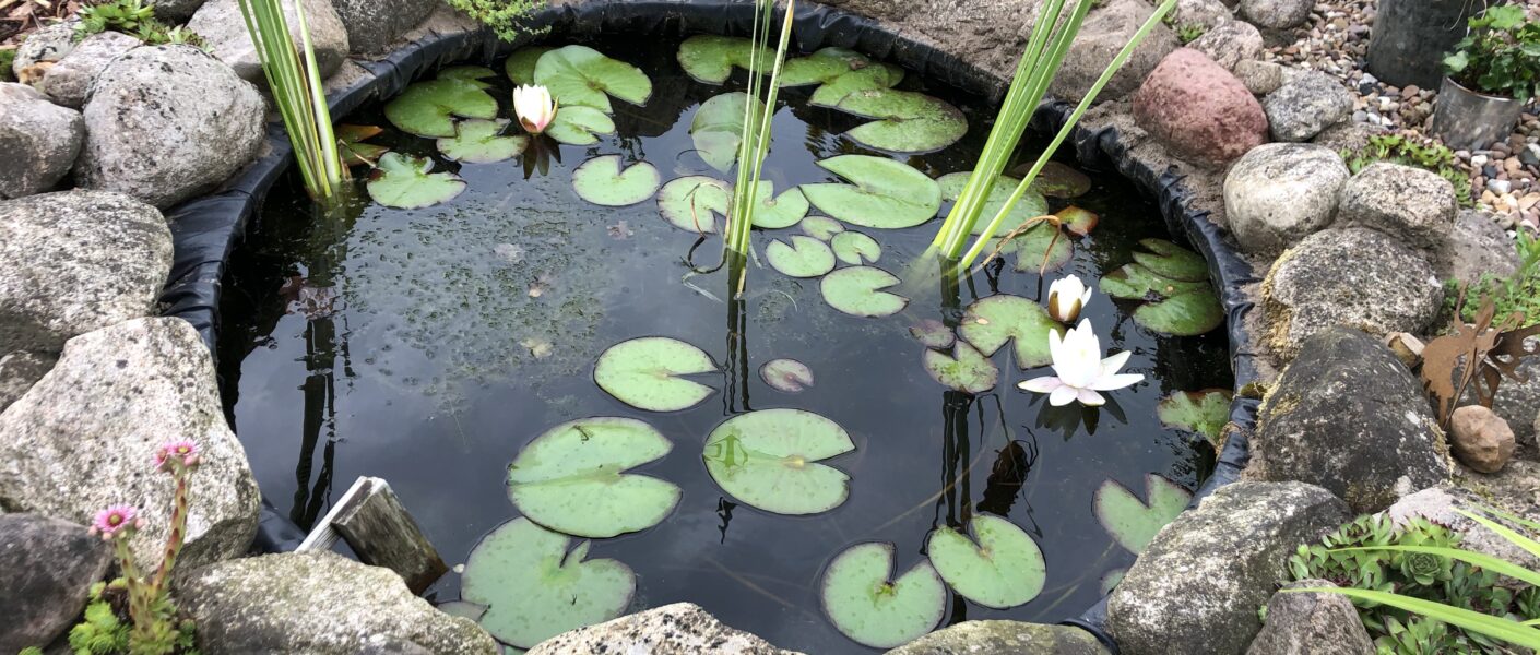 Als das Teichloch die entsprechende Tiefe hatte und der Grund glatt ausgehoben war, haben wir den Reifen reingerollt und mit Teichfolie ausgelegt, langsam Wasser einlaufen lassen und den äußeren Rand nach und nach wieder mit Erde aufgefüllt. Zum Schluss wurden dann noch Feldsteine drumherum gelegt, Teichpflanzen hineingestellt, mit Steinen fixiert und fertig war der „Teich“.